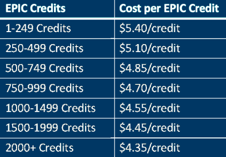 Quantity discounts for EPIC credits are determined by estimating the number of credits used annually. For volume purchases over 2000 credits please contact us.