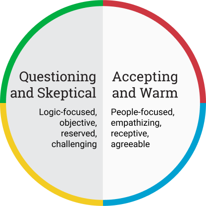 The horizontal dimension runs from questioning to accepting. People with DiSC styles that fall toward the left side of the circle are naturally more skeptical in nature and are often described as logic-focused, objective, and challenging. On the other hand, people with styles on the right side of the circle are naturally more receptive in nature and are often described as people-focused, empathizing, and agreeable.