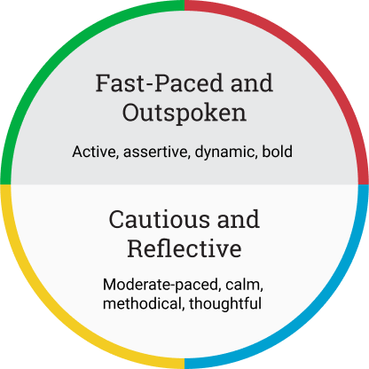 The vertical dimension is best described as level of activity, ranging from active to thoughtful. People with DiSC styles at the top of the circle tend to be fast-paced and are often described as assertive, dynamic, and bold. Conversely, people with styles that fall toward the bottom of the circle tend to be more moderate-paced and are often described as calm, methodical, and careful.